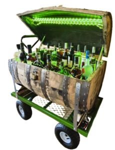Win this one-of-a-kind custom oak Barrel full of liquor. It can be used a rolling bar or cooler.